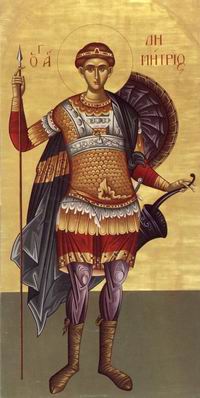 Sfântul Mare Mucenic Dimitrie a trăit pe vremea împăraţilor Diocleţian şi Maximian Galeriu (284- 311) şi era fiul voievodului cetaţii Tesalonicului. Este botezat în taina de părinţii săi, de frica cruntelor prigoane împotriva creştinilor, învăţându-l în cămara cea ascunsă a palatului lor toate tainele sfintei credinţe, deprinzându-l cu milostenia cea către săraci şi săvârşirea faptelor bune. Astfel, Sf. Dimitrie a cunoscut adevărul din cuvintele părinţilor săi, dar, mai ales, a început a lucra într-însul darul lui Dumnezeu. Tânărul Dimitrie creştea cu anii şi cu inţelepciunea, urcând în credinţă ca pe o scară. Şi, ajungând la vârsta cea mai desăvârşită, părinţii lui s-au dus din vremelnica viaţă, lăsâd pe tânărul Dimitrie moştenitor nu numai al multor averi, ci şi al bunului lor nume.